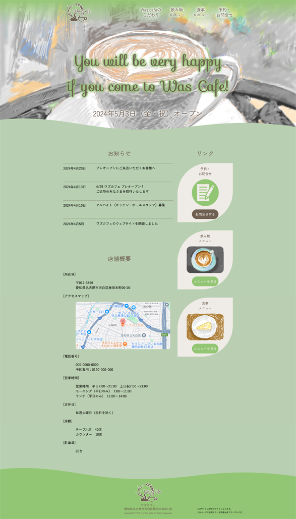 職業訓練校での始めの主要課題でWeb制作を行いました。お題はカフェ店のWebサイト制作でした。 設定はお客様から依頼のカフェのWebサイトを制作する。2024年5月にオープンする「WAS Cafe」の知名度を上げて集客につなげる狙い。 制作意図としては幅広い年齢層に受け入れられるようナチュラルな印象を与えることを考える。店の特徴であるコーヒーとパンのメニュー内容を伝える。