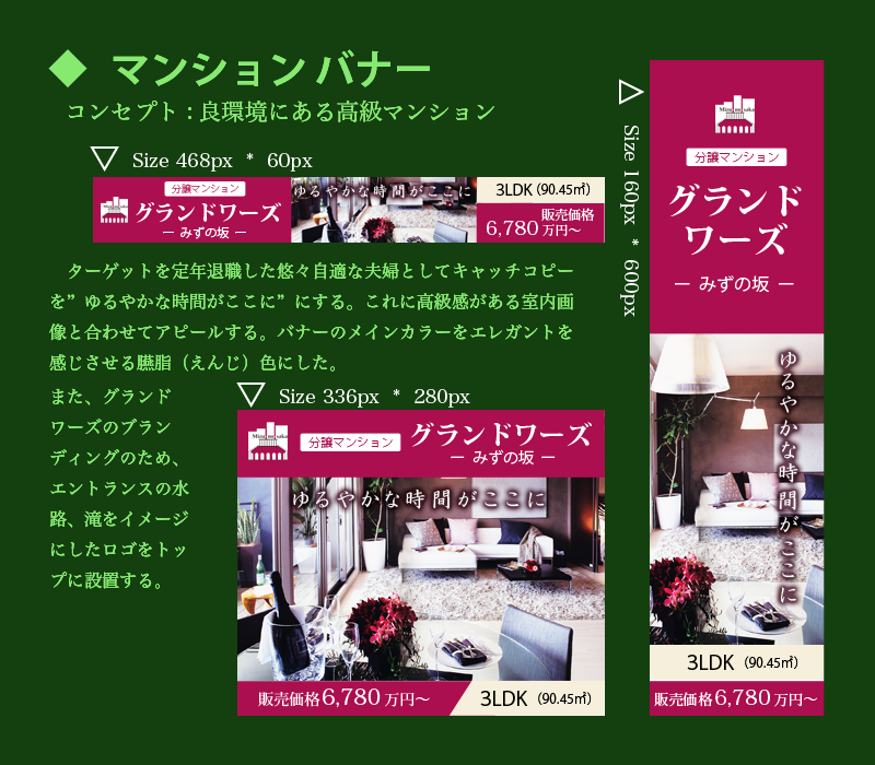 良環境にある高級マンションの宣伝バナー。ターゲットを定年退職した悠々自適な夫婦として制作した。